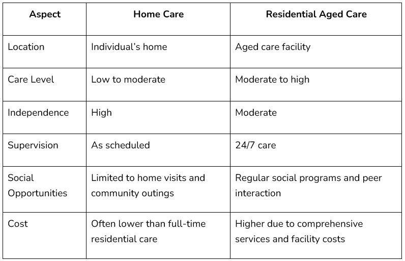 Residential Aged Care: Typically involves higher fees due to full-time accommodation, meals, and comprehensive care. Funding may include government support or private contributions depending on income and assets.